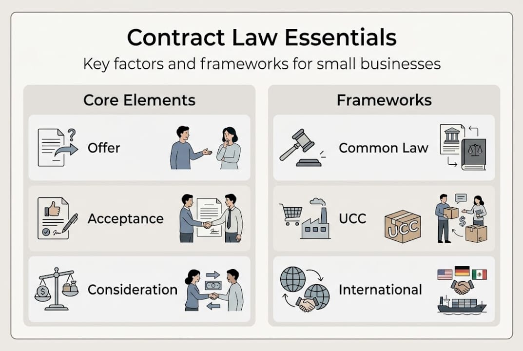 Contract law is the legal framework that makes agreements enforceable. In plain terms, contract law governs the creation, interpretation, enforcement, and remedies for legally binding agreements between parties. It covers everything from the handshake deal with your landlord to a multi-page vendor agreement with a supplier across state lines.