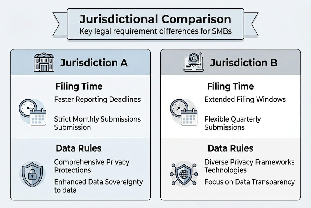 Multi-jurisdictional legal compliance means adhering to laws across multiple geographic regions where your business operates, sells products, or employs workers. Small to medium enterprises face complex legal requirements that differ across jurisdictions, increasing risk. When state, provincial, or national laws conflict, determining which rules take precedence becomes a critical challenge.