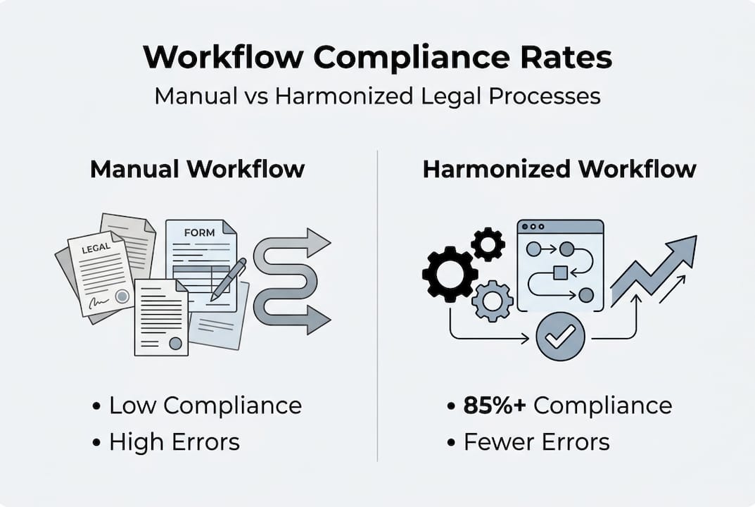Harmonized cross-border workflows achieve 85-90% compliance rates. That gap between manual and harmonized execution is not marginal. It represents real exposure: contracts that may not hold up, penalties that accumulate, and reputational risk that is hard to quantify.