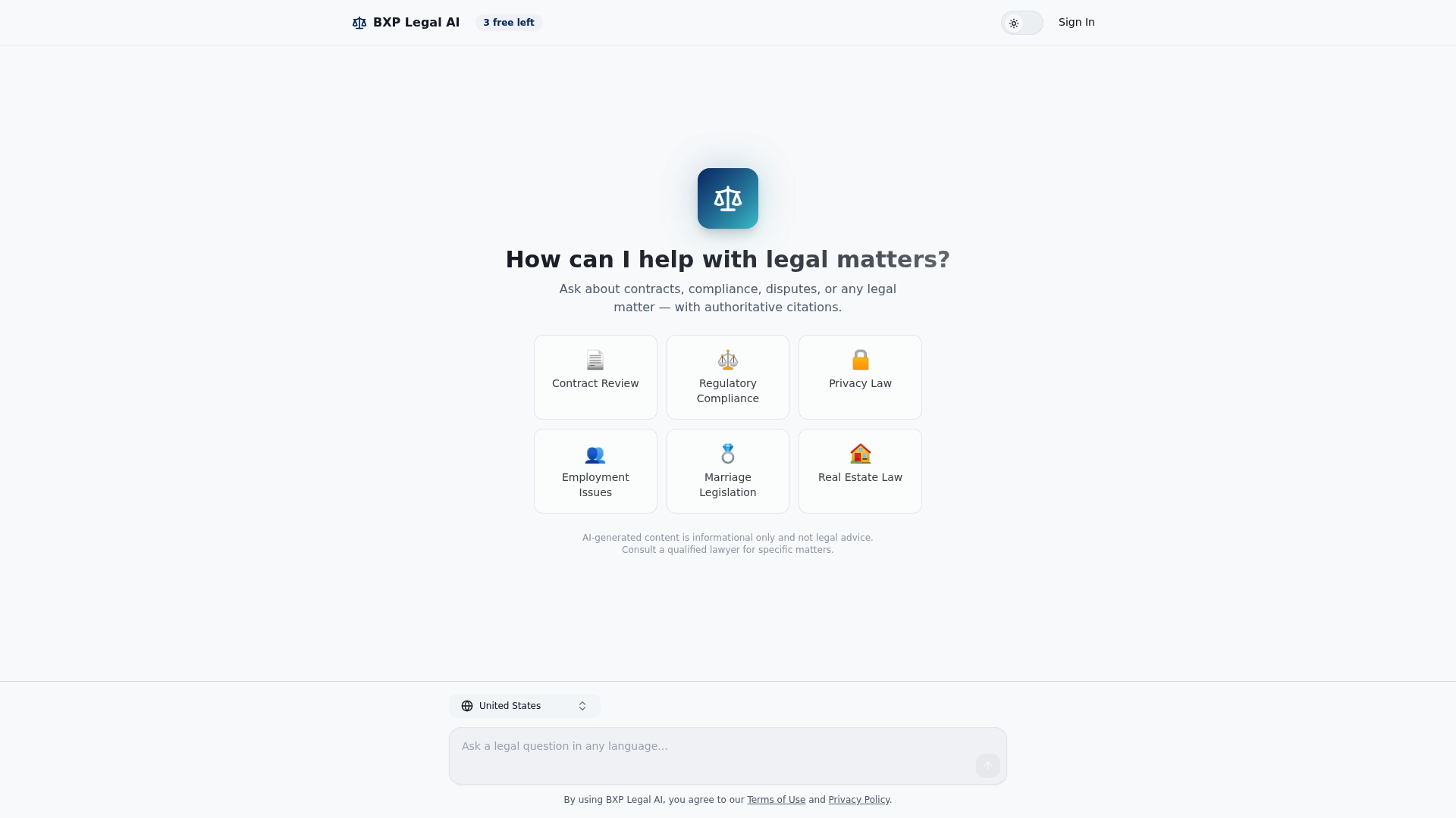 BXP Legal AI offers Contract Review, Regulatory Compliance, privacy law help, employment issue guidance, marriage legislation insights, and real estate law reference in a single interface.