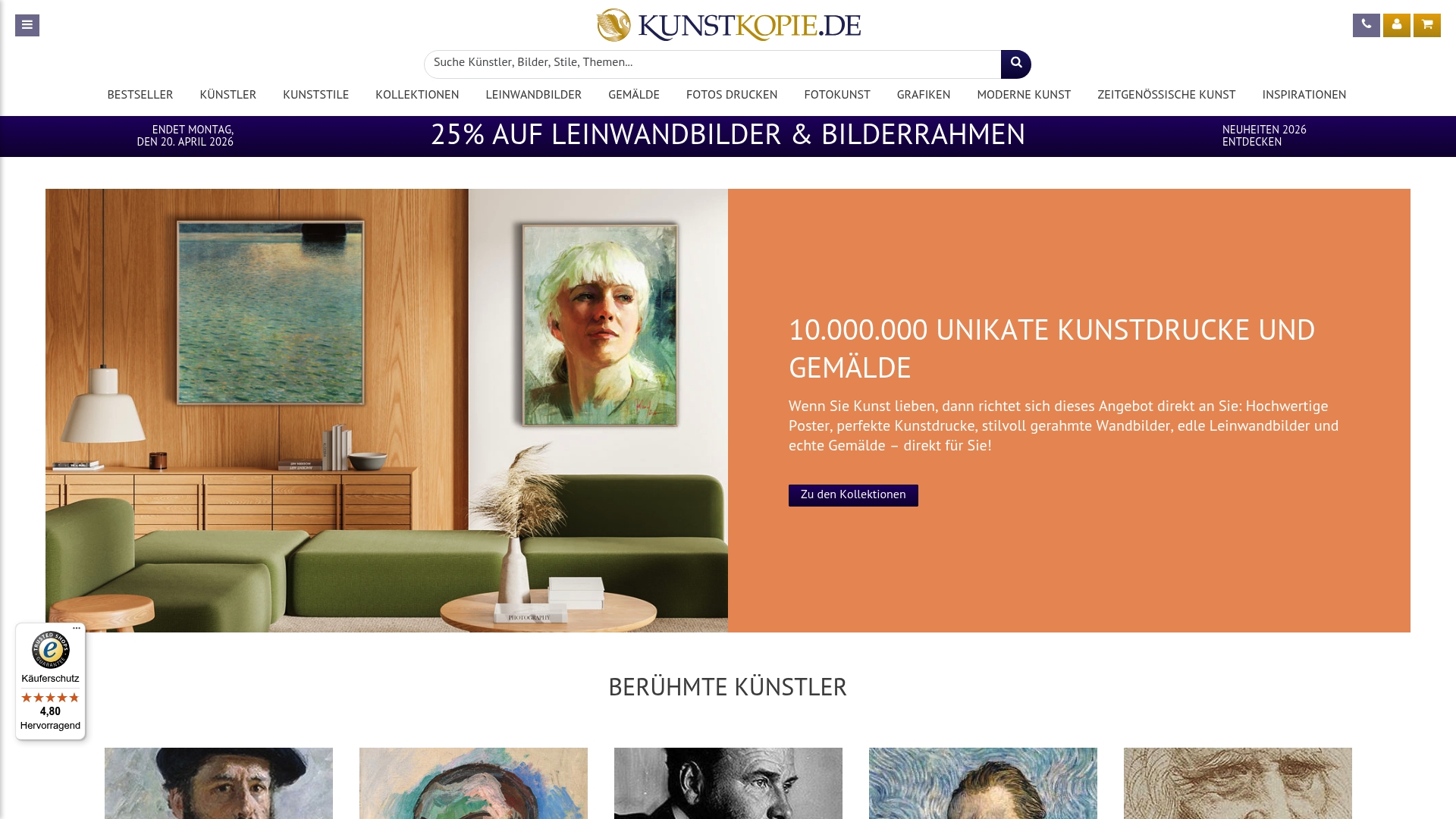 Kunstkopie.de offers a vast catalog of high quality art prints and framed works produced to order in Hamburg. If you want museum style reproductions in custom sizes and premium materials, this site delivers strong quality with attentive customer service.