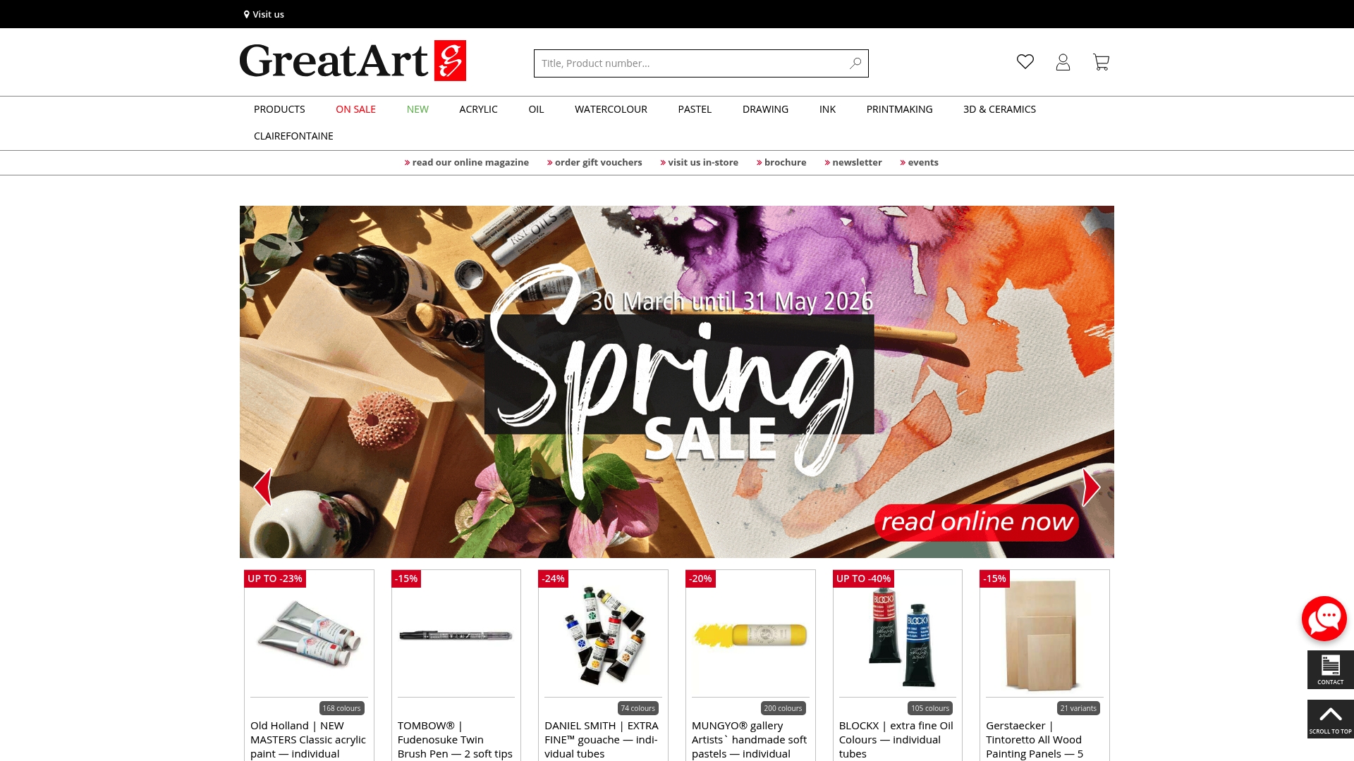 Great Art stocks paints, canvases, brushes, papers, and framing materials across major mediums including oil, acrylic, watercolor, pastel, drawing, printmaking, and sculpture. The site also lists gift sets and starter kits and supports learning with an online magazine, workshops, and events.
